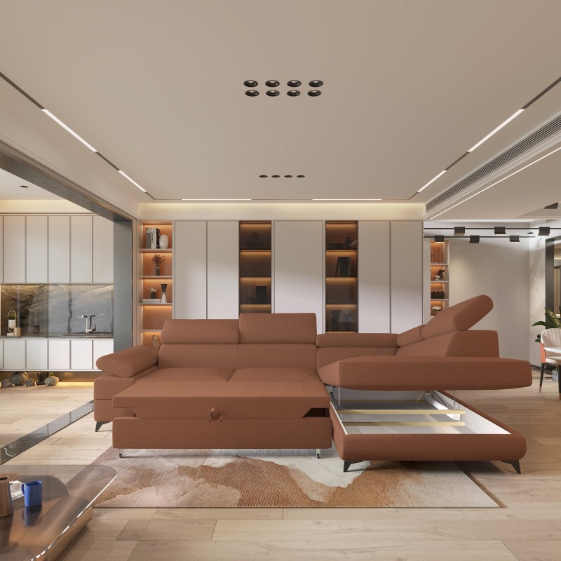 Masseno Narożnik FAVIEN z funkcją spania i pojemnikiem na pościel Narozniki L, Rozkładana sofa - Miedziany, QUELLE 54