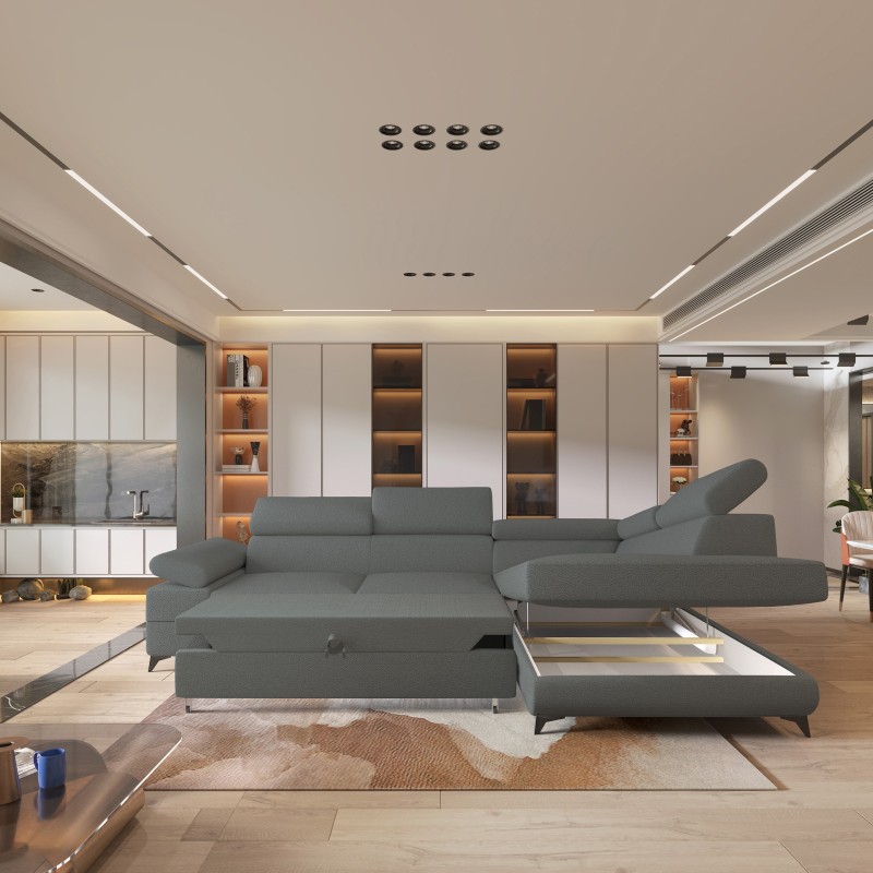 Dzięki funkcji spania rozłożysz go w kilka chwil i zyskasz wygodne łóżko dla niezapowiedzianych gości. Pojemny schowek ukryty w otomanie to praktyczna przestrzeń na pościel, pledy czy rzadziej używane poduszki. Regulowane zagłówki i podłokietnik dają Ci pełną kontrolę nad tym, jak odpoczywasz – czy siedzisz prosto podczas porannej kawy, czy leżysz wygodnie z książką w ręce. A to wszystko na sprężynach falistych, które dbają o komfort nawet po długim dniu. Tkanina Quelle zachwyca subtelną strukturą, jest przyjemna w dotyku i odporna na codzienne użytkowanie. Wersja lewo- lub prawostronna pozwoli precyzyjnie dopasować narożnik do układu wnętrza.