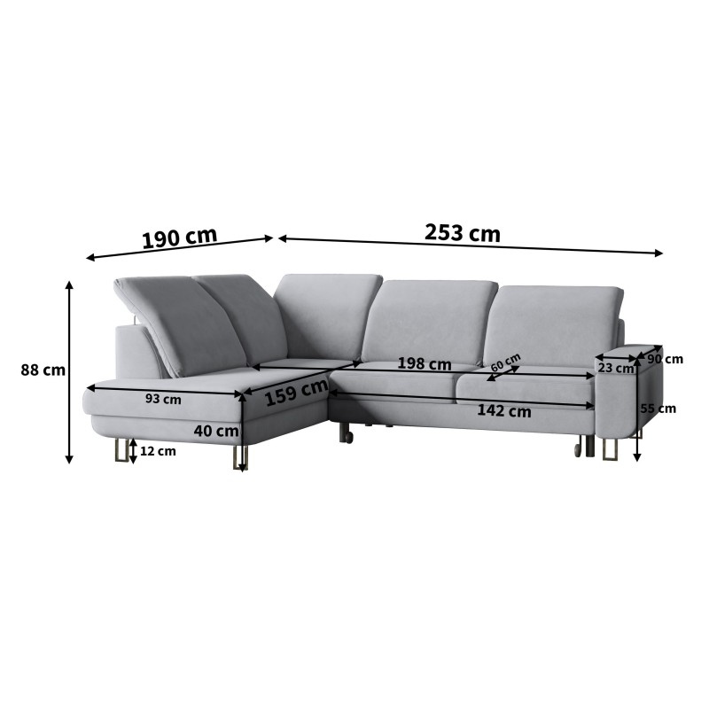 Zintegrowane z oparciem regulowane zagłówki gwarantują indywidualny komfort podczas czytania lub seansu filmowego. Praktyczny pojemnik w otomanie pomaga utrzymać porządek, a funkcja spania umożliwia szybkie stworzenie wygodnego miejsca noclegowego. Sprężyny faliste dbają o trwałość i sprężystość siedziska, a wysokie nóżki ułatwiają sprzątanie oraz poprawiają wentylację mebla.