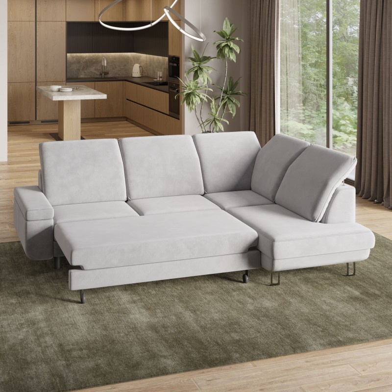 Zintegrowane z oparciem regulowane zagłówki gwarantują indywidualny komfort podczas czytania lub seansu filmowego. Praktyczny pojemnik w otomanie pomaga utrzymać porządek, a funkcja spania umożliwia szybkie stworzenie wygodnego miejsca noclegowego. Sprężyny faliste dbają o trwałość i sprężystość siedziska, a wysokie nóżki ułatwiają sprzątanie oraz poprawiają wentylację mebla.