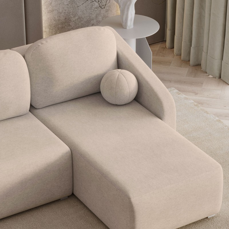 Dwie obszerne poduszki oparciowe oraz dekoracyjna poduszka w kształcie kulki sprawiają, że MARELLO to narożnik nie tylko praktyczny, ale i pełen stylu. Ozdobny detal przyciąga wzrok, nadając meblowi designerskiego sznytu, a jednocześnie podkreśla jego przyjazny i nowoczesny charakter. W tkaninie Neve MARELLO prezentuje się wyjątkowo elegancko. Neve to materiał o delikatnej, welwetowej strukturze, przyjemnej w dotyku i subtelnie matowej. Jej miękkość i szlachetny wygląd doskonale łączą się z funkcjonalnością – tkanina jest wytrzymała i odporna na codzienne użytkowanie. To sprawia, że narożnik świetnie odnajdzie się w różnych aranżacjach – od nowoczesnego minimalizmu, przez japandi, aż po klasyczne wnętrza z nutą elegancji.