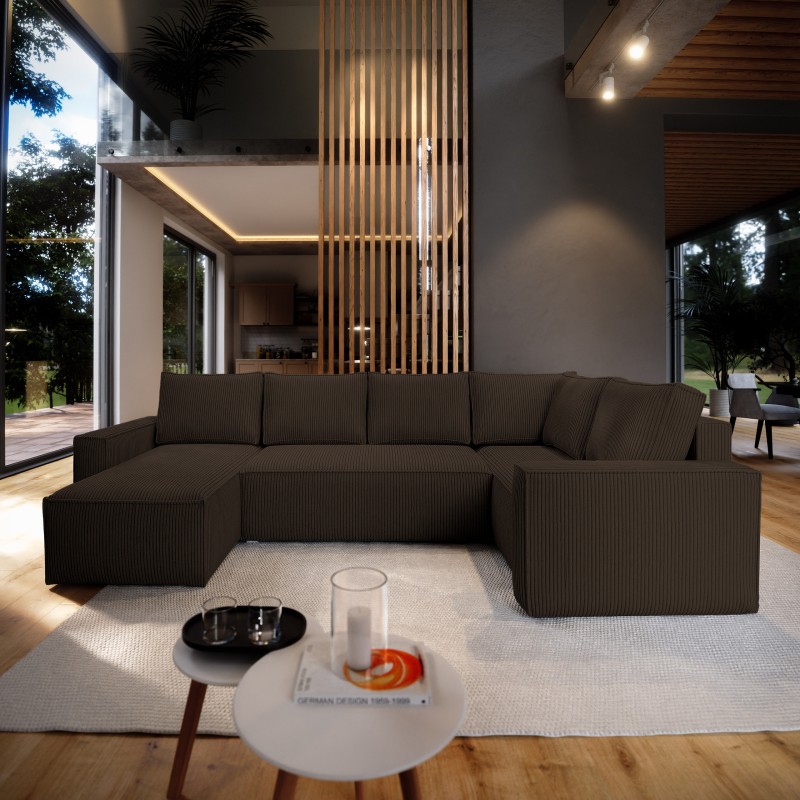 Masseno Narożnik NORENA z funkcją spania i pojemnikiem na pościel Narozniki U, Rozkładana sofa - Brązowy, POSO 06