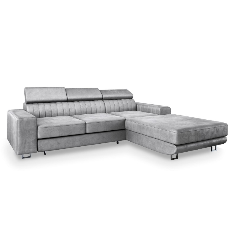 Funkcja spania szybko zamienia narożnik w wygodne łóżko – idealne dla gości lub jako codzienna przestrzeń do snu. Wysokie, metalowe nóżki nadają lekkości i ułatwiają sprzątanie pod meblem.