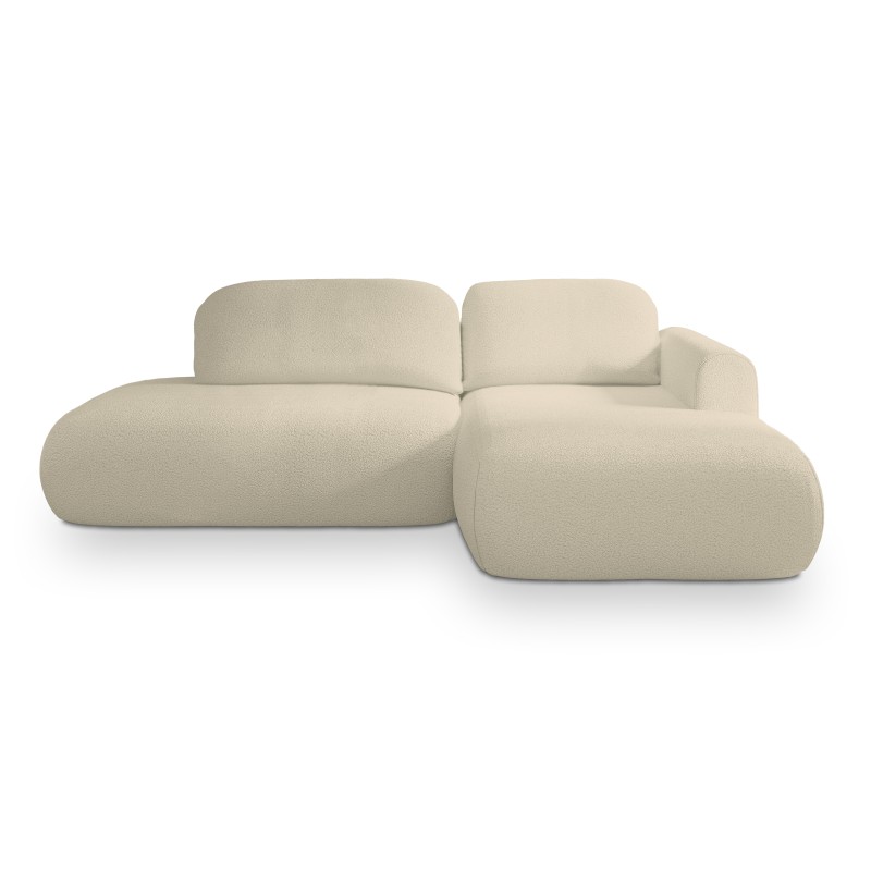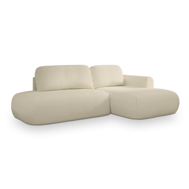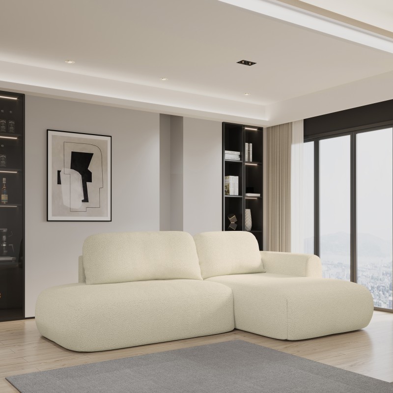 Narożnik został obity luksusową tkaniną QUELLE o strukturze typu boucle, potocznie nazywaną „barankiem”. Jej miękka, pętelkowa powierzchnia tworzy efekt naturalnego, tekstylnego ciepła, nadając meblowi wyjątkową miękkość i wizualną lekkość.