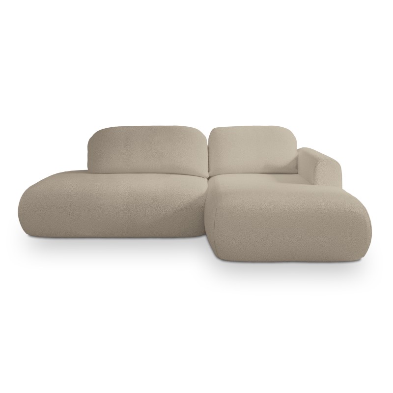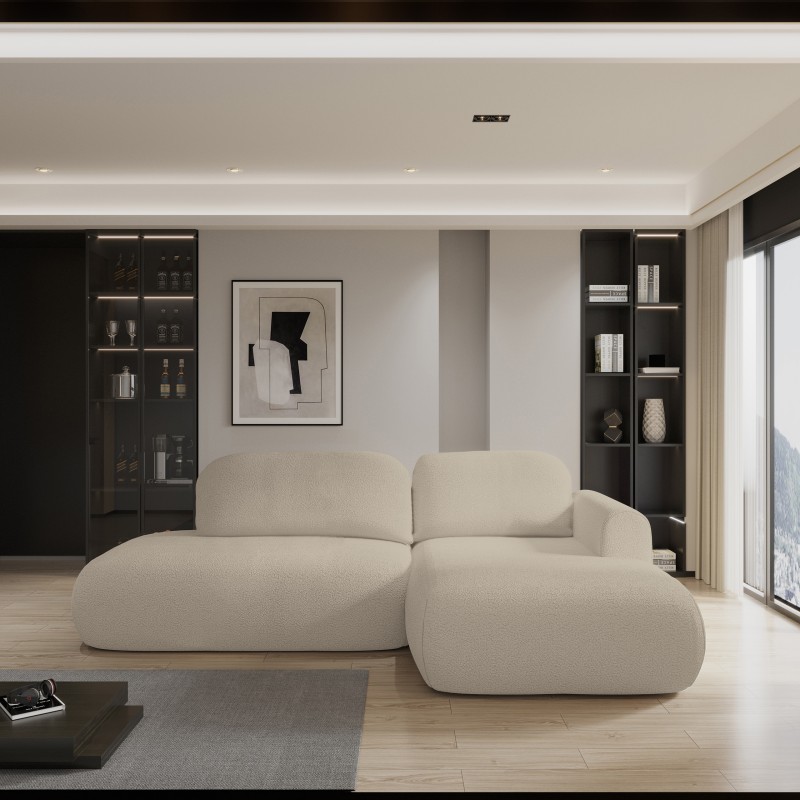 Narożnik został obity luksusową tkaniną QUELLE o strukturze typu boucle, potocznie nazywaną „barankiem”. Jej miękka, pętelkowa powierzchnia tworzy efekt naturalnego, tekstylnego ciepła, nadając meblowi wyjątkową miękkość i wizualną lekkość.