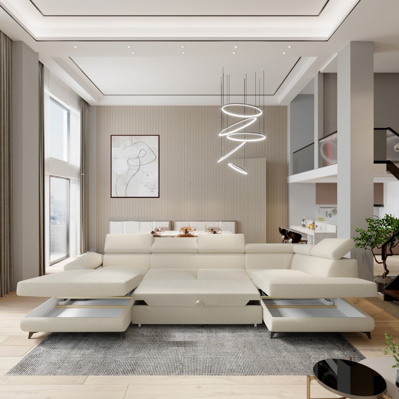 Masseno Narożnik RUBANO z funkcją spania i pojemnikiem na pościel Narozniki U, Rozkładana sofa - Kremowy, QUELLE 02