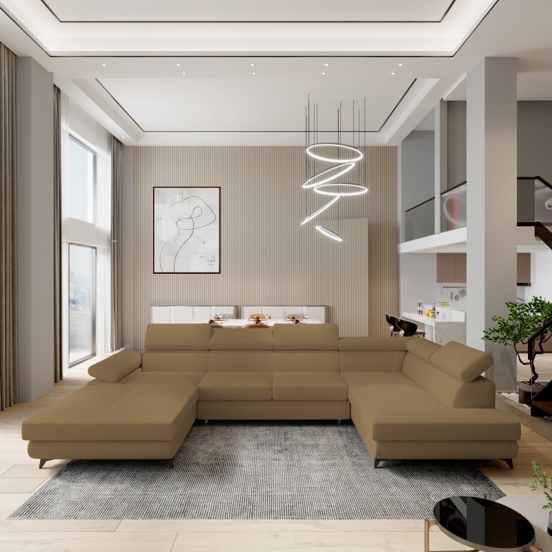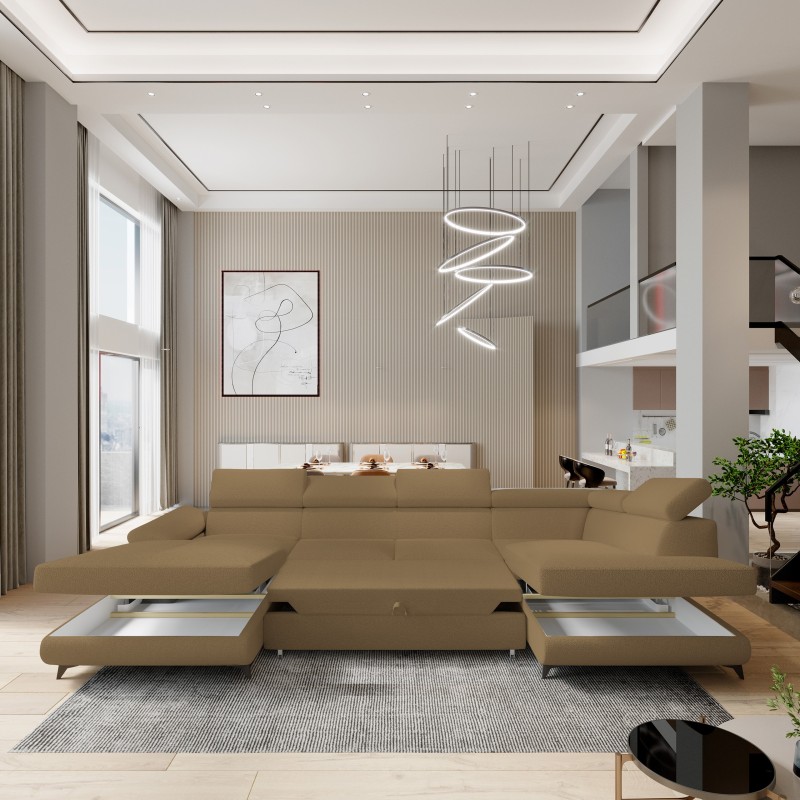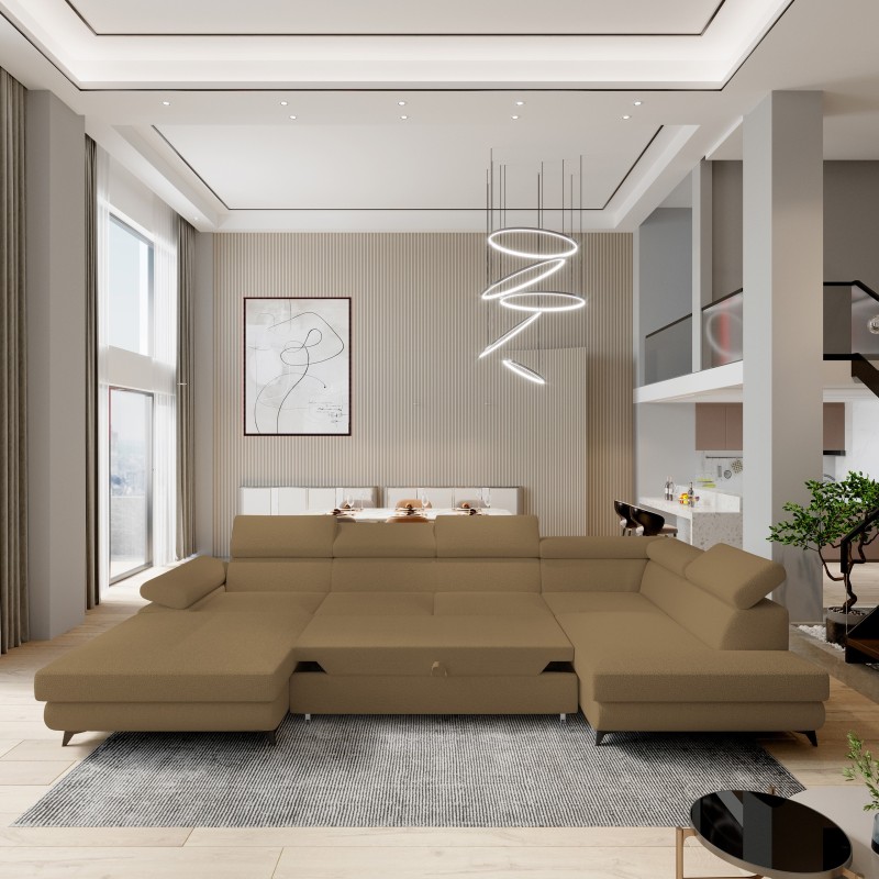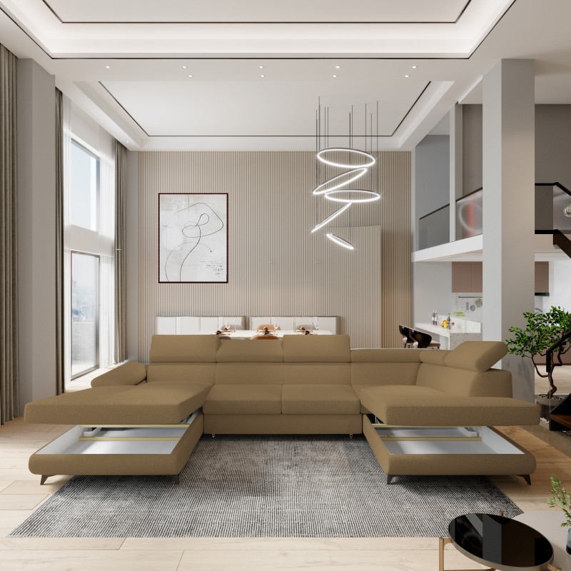 Funkcja spania wbudowana w narożnik pozwala szybko zmienić salon w komfortową przestrzeń noclegową - bez kompromisów, bez wysiłku. Dwa pojemniki na pościel to ukryty atut, który ułatwia życie: pozwalają uporządkować przestrzeń, jednocześnie pozostając całkowicie niewidoczne. Niezależnie od tego, czy urządzasz nowoczesny salon w apartamencie, czy szukasz stylowego mebla do przestronnej strefy dziennej, RUBANO daje Ci pełną elastyczność – dostępny jest w wersji prawo- i lewostronnej. Regulowane zagłówki i podłokietnik umożliwiają personalizację pozycji, zwiększając wygodę w każdej sytuacji – czy to relaks z książką, czy filmowy wieczór. RUBANO to narożnik, który staje się integralną częścią codzienności – subtelnie, ale zdecydowanie.
