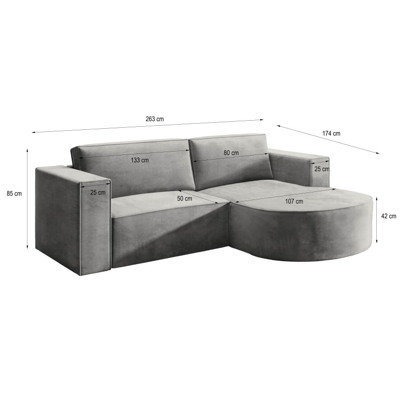 Narożnik SORELA przyciąga uwagę swoją oryginalną formą i wysokim komfortem użytkowania. Jego wyróżnikiem jest zaokrąglona część z szezlongiem, która dodaje całości nowoczesnego charakteru i lekkości wizualnej. Delikatna asymetria i wyważone proporcje sprawiają, że mebel idealnie odnajduje się w nowoczesnych aranżacjach, prezentując się niezwykle elegancko.