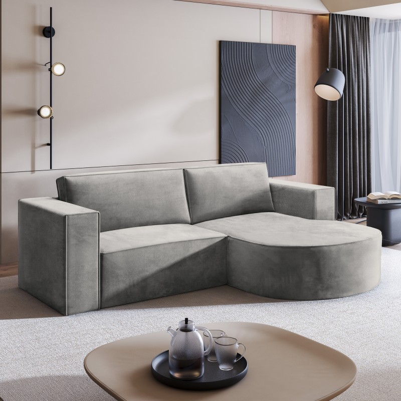 Narożnik SORELA przyciąga uwagę swoją oryginalną formą i wysokim komfortem użytkowania. Jego wyróżnikiem jest zaokrąglona część z szezlongiem, która dodaje całości nowoczesnego charakteru i lekkości wizualnej. Delikatna asymetria i wyważone proporcje sprawiają, że mebel idealnie odnajduje się w nowoczesnych aranżacjach, prezentując się niezwykle elegancko.