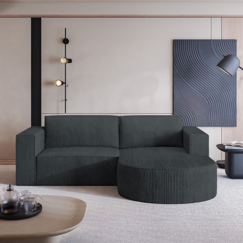 Narożnik SORELA przyciąga uwagę swoją oryginalną formą i wysokim komfortem użytkowania. Jego wyróżnikiem jest zaokrąglona część z szezlongiem, która dodaje całości nowoczesnego charakteru i lekkości wizualnej. Delikatna asymetria i wyważone proporcje sprawiają, że mebel idealnie odnajduje się w nowoczesnych aranżacjach, prezentując się niezwykle elegancko.