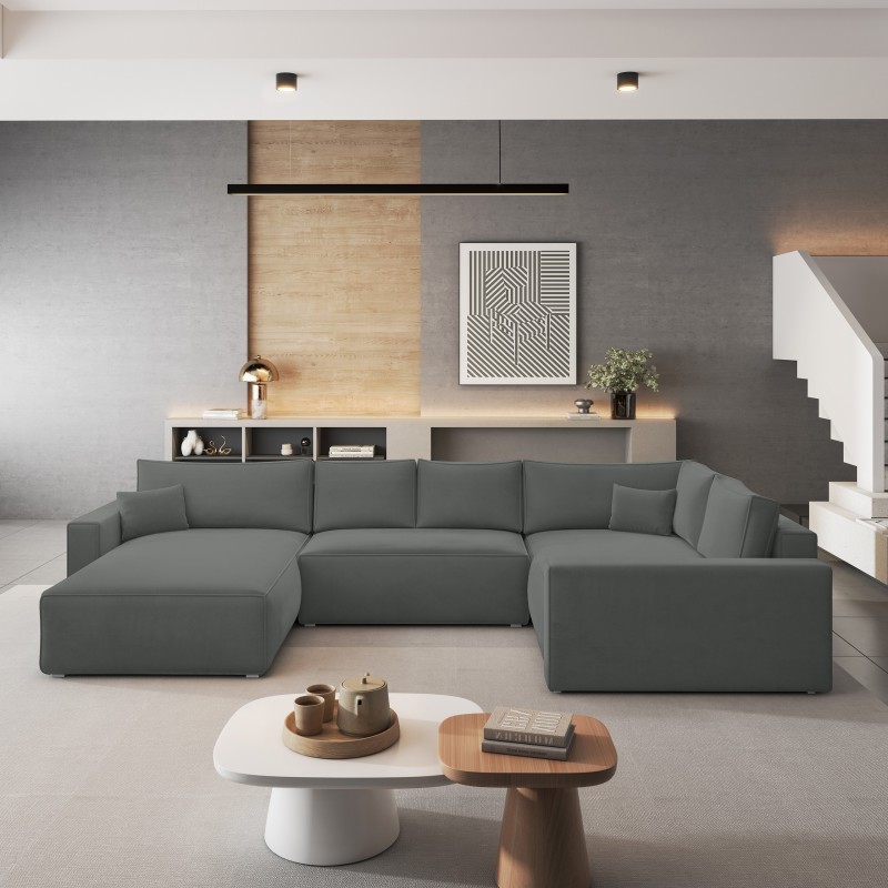 Odkryj narożnik VELAMI – luksusowy, komfortowy i wyjątkowo praktyczny mebel. Duży u-kształtny narożnik, pozwoli wygodnie spędzać czas z najbliższymi. Wyobraź sobie niedzielne popołudnie, gdy cała rodziną możecie oddać się filmowym seansom lub wygodnie spędzić czas przy ulubionych planszówkach.