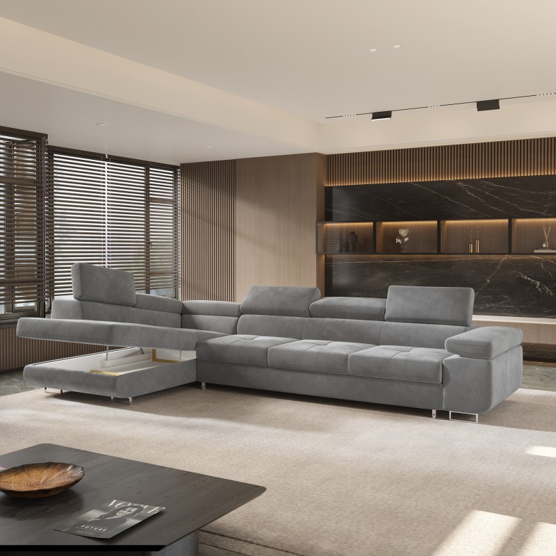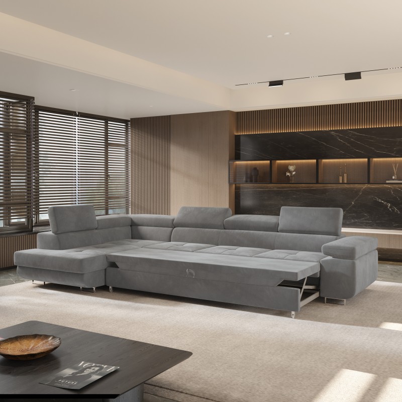 Masseno Narożnik VICENTE z funkcją spania i pojemnikiem na pościel Narozniki L, Rozkładana sofa - Szary, MONOLITH 85
