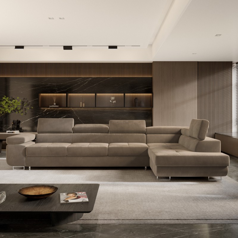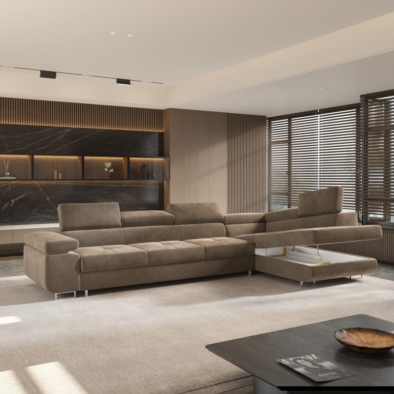 VICENTE to narożnik stworzony dla tych, którzy pragną połączyć nowoczesny design, najwyższy poziom wygody i przestrzeń do wspólnego spędzania czasu. Jego elegancka, dopracowana w każdym detalu forma zachwyca smukłymi liniami, wygodnym podłokietnikiem i regulowanymi zagłówkami, które pozwalają dopasować mebel do indywidualnych preferencji.