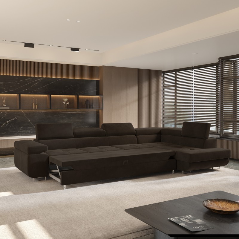 Masseno Narożnik VICENTE z funkcją spania i pojemnikiem na pościel Narozniki L, Rozkładana sofa - Brązowy, MONOLITH 29