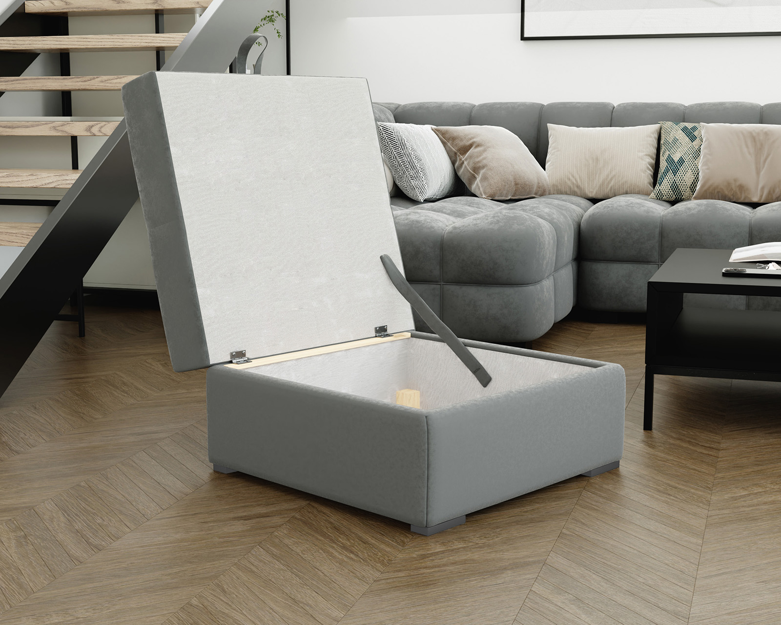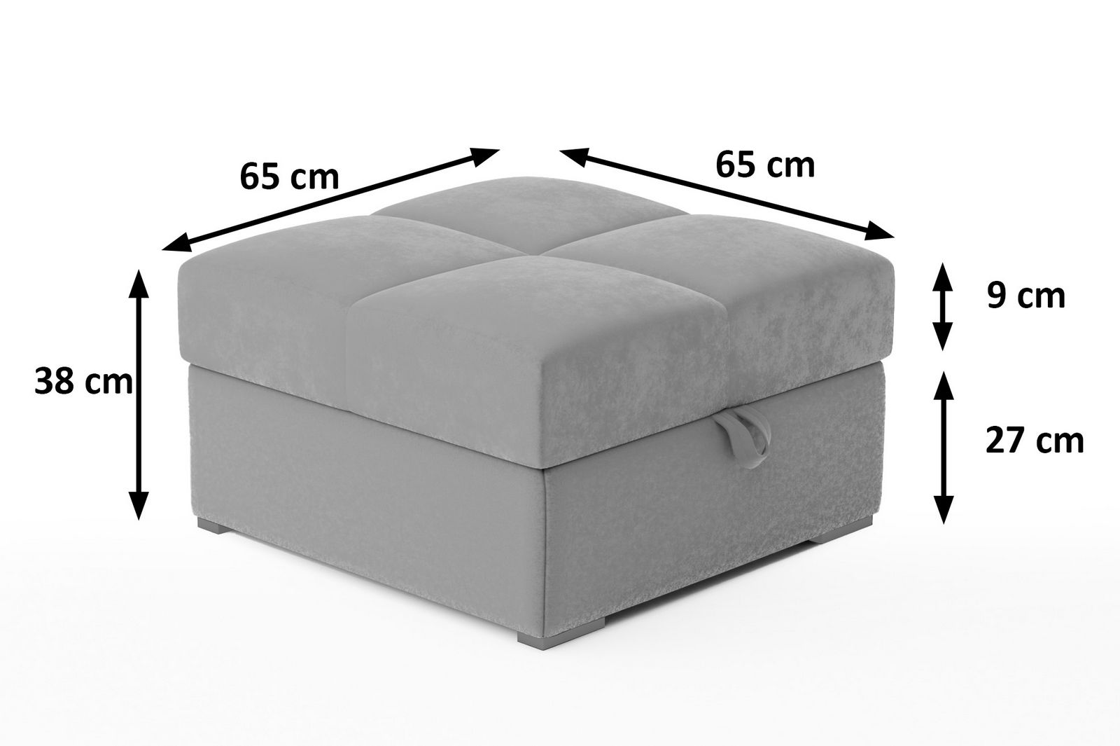 Pufa zaskakuje dużym pojemnikiem w podstawie, idealnym do przechowywania różnych drobiazgów, zabawek czy jako podręczne miejsce na koce. Doskonałe rozwiązanie dla tych, którzy cenią porządek i funkcjolaność. Dostęp do schowka ułatwia materiałowy uchwyt.