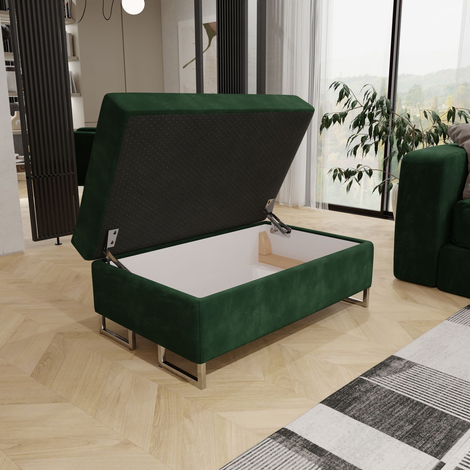 Zyskaj na funkcjonalności dzięki praktycznemu schowkowi z automatem sprężynowym. Dzięki niemu z łatwością przechowasz różne przedmioty, a siedzisko samo nie opada, gwarantując bezpieczny dostęp do sporego pojemnika. Dodatkowo, drewniane wstawki wpływające pozytywnie na stabilność, sprawiają, że pufa jest nie tylko piękna, ale też solidna.