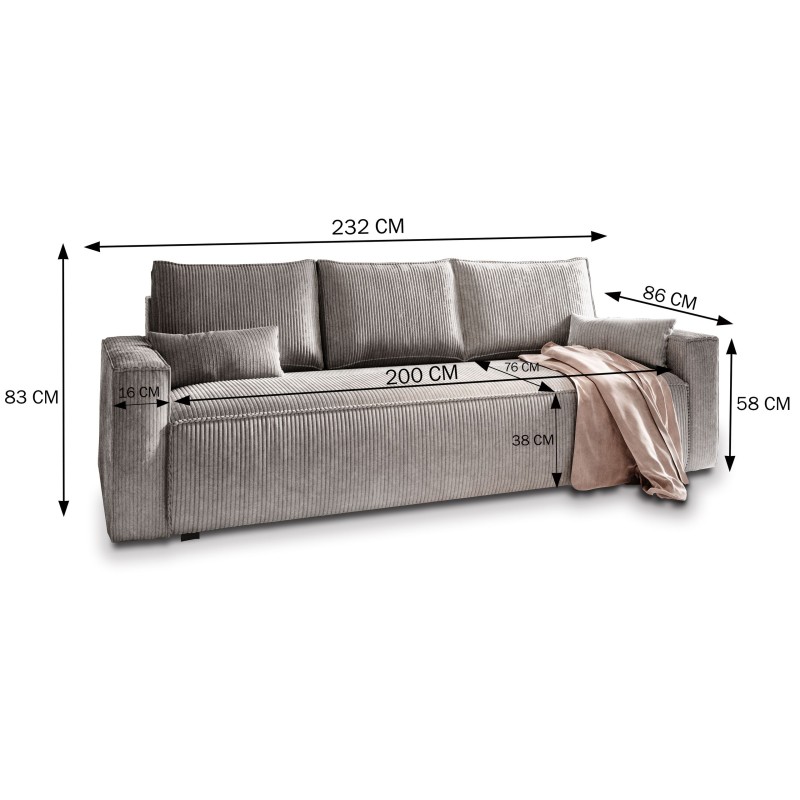 Rozkładana Kanapa MENI, jest wykonana w modnym i eleganckim sztruksowym materiale, zgodnie z najnowszymi światowymi trendami. Ponadczasowy design, przyjemna i miękka w dotyku tkanina POSO, która występuje w wielu przebojowych kolorach, doda pomieszczeniom przytulnego klimatu.