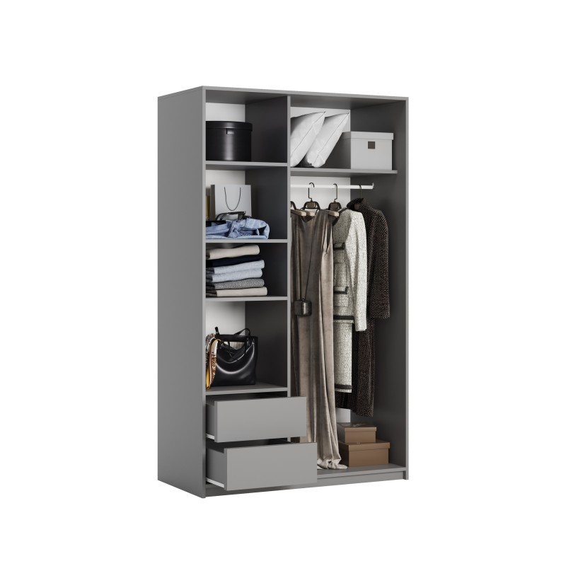 Wysokiej jakości system drzwi przesuwnych z aluminium zapewnia płynne i ciche użytkowanie, a duże lustro optycznie powiększa pomieszczenie i wprowadza więcej światła. Wnętrze szafy zostało zaprojektowane z myślą o praktycznym przechowywaniu – znajdziesz tu 2 pojemne szuflady, drążek na wieszaki i półki na odzież, buty lub dodatki.