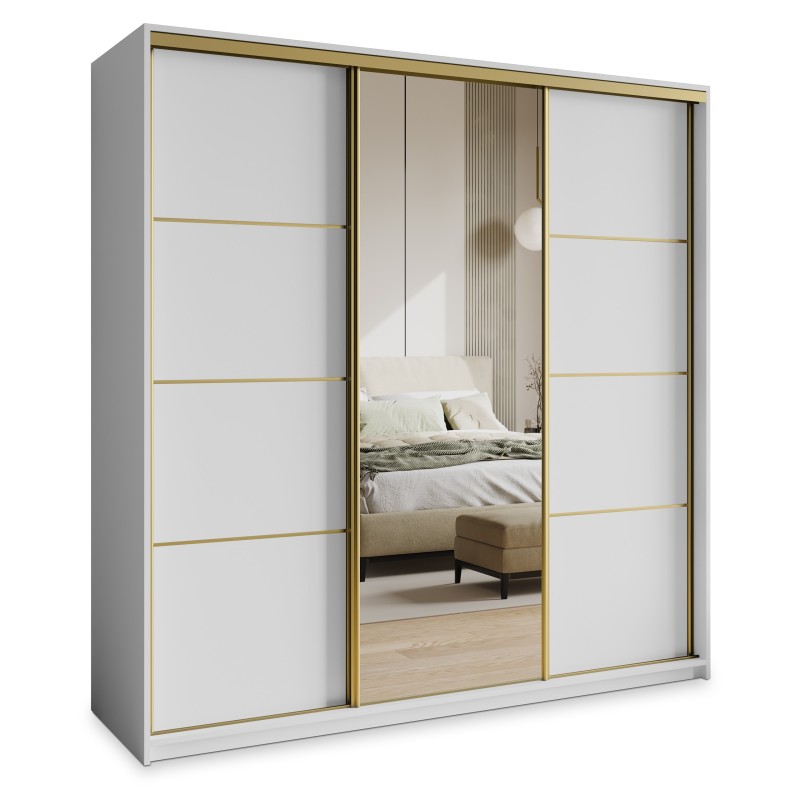 Wysokiej jakości system drzwi przesuwnych z aluminium zapewnia płynne i ciche użytkowanie, a duże lustro optycznie powiększa pomieszczenie i wprowadza więcej światła. Wnętrze szafy zostało zaprojektowane z myślą o praktycznym przechowywaniu – znajdziesz tu 4 pojemne szuflady, drążek na wieszaki i półki na odzież, buty lub dodatki.