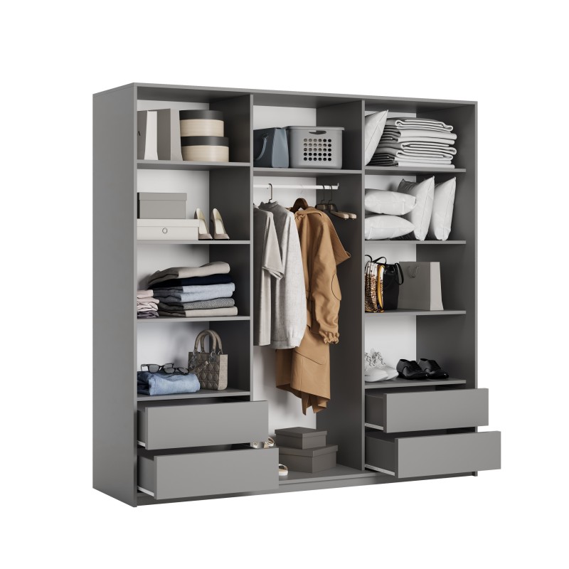 Wysokiej jakości system drzwi przesuwnych z aluminium zapewnia płynne i ciche użytkowanie, a duże lustro optycznie powiększa pomieszczenie i wprowadza więcej światła. Wnętrze szafy zostało zaprojektowane z myślą o praktycznym przechowywaniu – znajdziesz tu 4 pojemne szuflady, drążek na wieszaki i półki na odzież, buty lub dodatki.