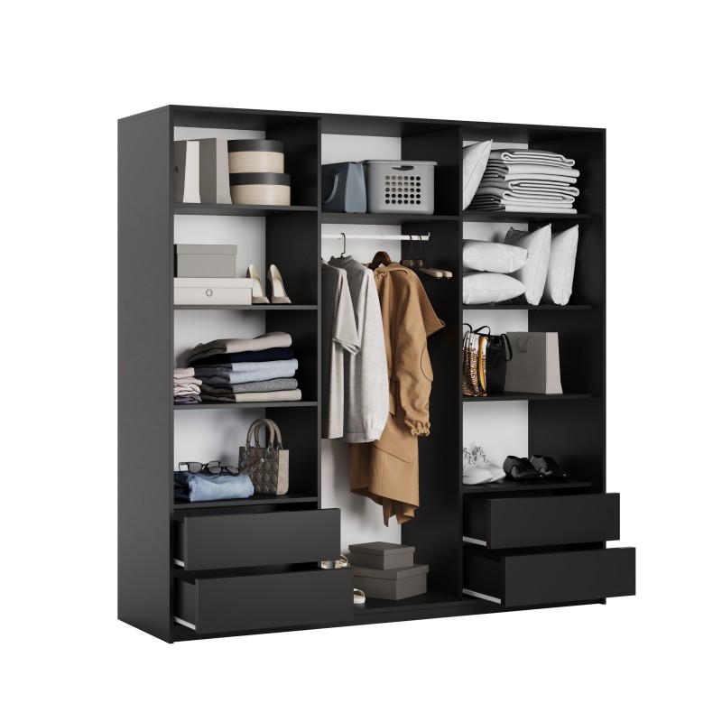 Wysokiej jakości system drzwi przesuwnych z aluminium zapewnia płynne i ciche użytkowanie. Wnętrze szafy zostało zaprojektowane z myślą o praktycznym przechowywaniu – znajdziesz tu 4 pojemne szuflady, drążek na wieszaki i półki na odzież, buty lub dodatki.