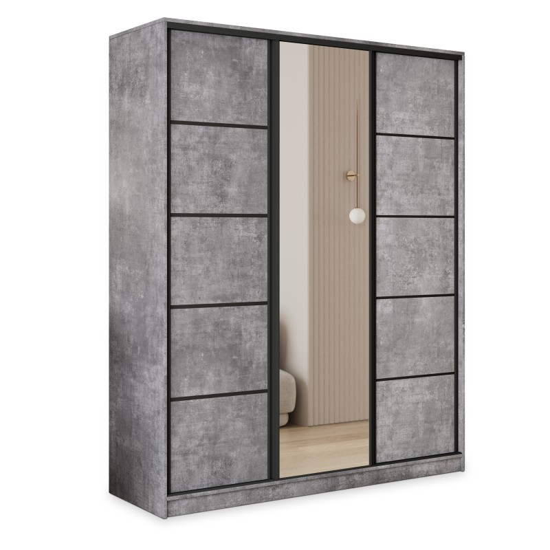 Wysokiej jakości system drzwi przesuwnych z aluminium zapewnia płynne i ciche użytkowanie, a duże lustro optycznie powiększa pomieszczenie i wprowadza więcej światła. Wnętrze szafy zostało zaprojektowane z myślą o praktycznym przechowywaniu – znajdziesz tu 4 pojemne szuflady, drążek na wieszaki i półki na odzież, buty lub dodatki.