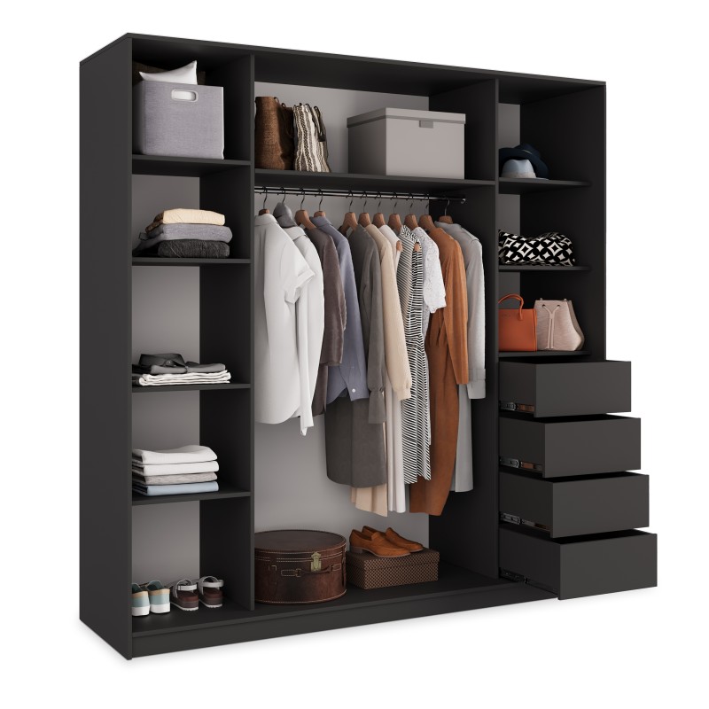 Wysokiej jakości system drzwi przesuwnych z aluminium zapewnia płynne i ciche użytkowanie, a duże lustro optycznie powiększa pomieszczenie i wprowadza więcej światła. Wnętrze szafy zostało zaprojektowane z myślą o praktycznym przechowywaniu – znajdziesz tu 4 pojemne szuflady, drążek na wieszaki i półki na odzież, buty lub dodatki.