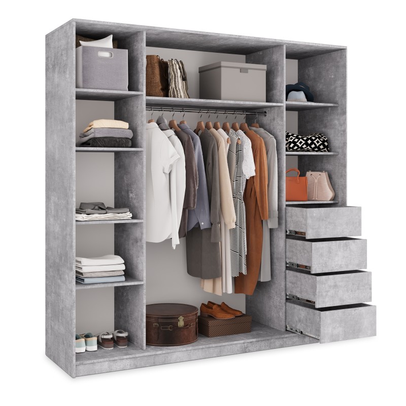 Wysokiej jakości system drzwi przesuwnych z aluminium zapewnia płynne i ciche użytkowanie, a duże lustro optycznie powiększa pomieszczenie i wprowadza więcej światła. Wnętrze szafy zostało zaprojektowane z myślą o praktycznym przechowywaniu – znajdziesz tu 4 pojemne szuflady, drążek na wieszaki i półki na odzież, buty lub dodatki.