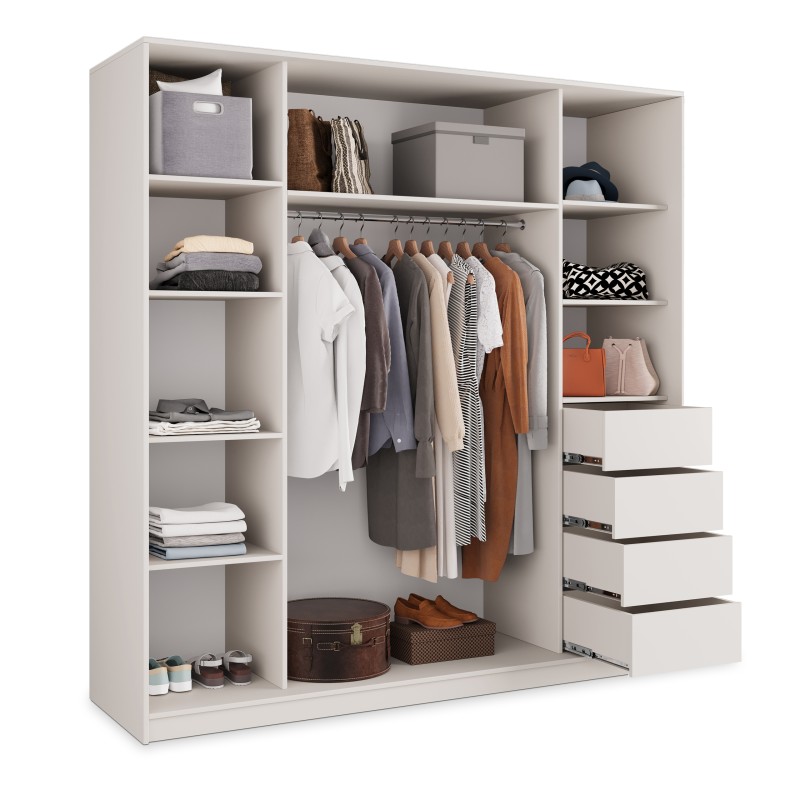 Wysokiej jakości system drzwi przesuwnych z aluminium zapewnia płynne i ciche użytkowanie, a duże lustro optycznie powiększa pomieszczenie i wprowadza więcej światła. Wnętrze szafy zostało zaprojektowane z myślą o praktycznym przechowywaniu – znajdziesz tu 4 pojemne szuflady, drążek na wieszaki i półki na odzież, buty lub dodatki.