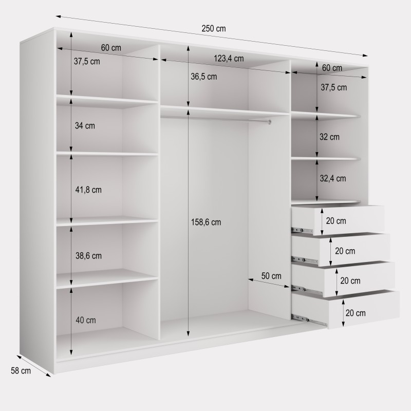 Wysokiej jakości system drzwi przesuwnych z aluminium zapewnia płynne i ciche użytkowanie, a duże lustro optycznie powiększa pomieszczenie i wprowadza więcej światła. Wnętrze szafy zostało zaprojektowane z myślą o praktycznym przechowywaniu – znajdziesz tu 4 pojemne szuflady, drążek na wieszaki i półki na odzież, buty lub dodatki.