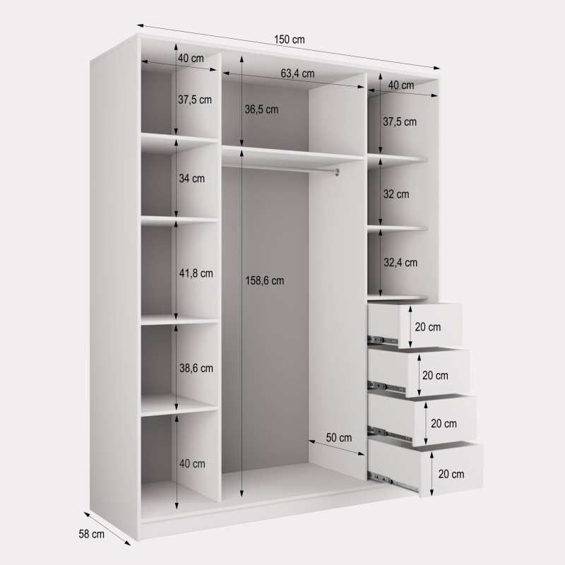 Wysokiej jakości system drzwi przesuwnych z aluminium zapewnia płynne i ciche użytkowanie, a duże lustro optycznie powiększa pomieszczenie i wprowadza więcej światła. Wnętrze szafy zostało zaprojektowane z myślą o praktycznym przechowywaniu – znajdziesz tu 4 pojemne szuflady, drążek na wieszaki i półki na odzież, buty lub dodatki.