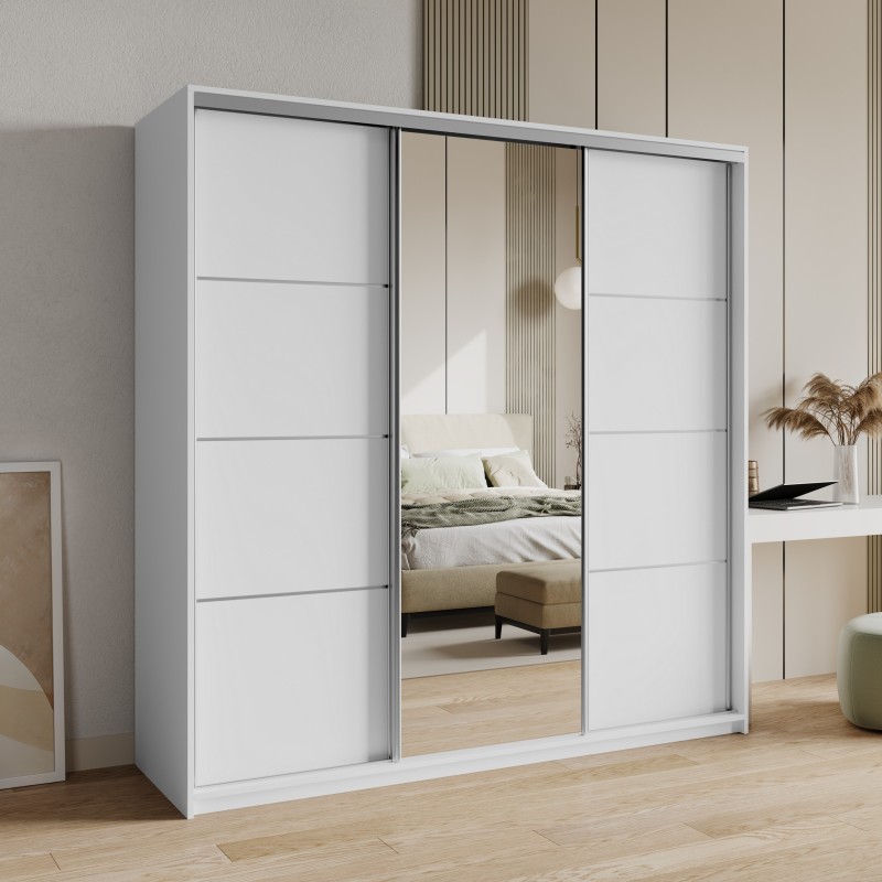 Wysokiej jakości system drzwi przesuwnych z aluminium zapewnia płynne i ciche użytkowanie, a duże lustro optycznie powiększa pomieszczenie i wprowadza więcej światła. Wnętrze szafy zostało zaprojektowane z myślą o praktycznym przechowywaniu – znajdziesz tu 4 pojemne szuflady, drążek na wieszaki i półki na odzież, buty lub dodatki.