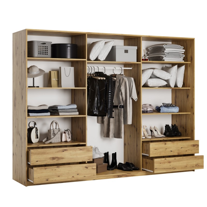 Wysokiej jakości system drzwi przesuwnych z aluminium zapewnia płynne i ciche użytkowanie. Wnętrze szafy zostało zaprojektowane z myślą o praktycznym przechowywaniu – znajdziesz tu 4 pojemne szuflady, drążek na wieszaki i półki na odzież, buty lub dodatki.