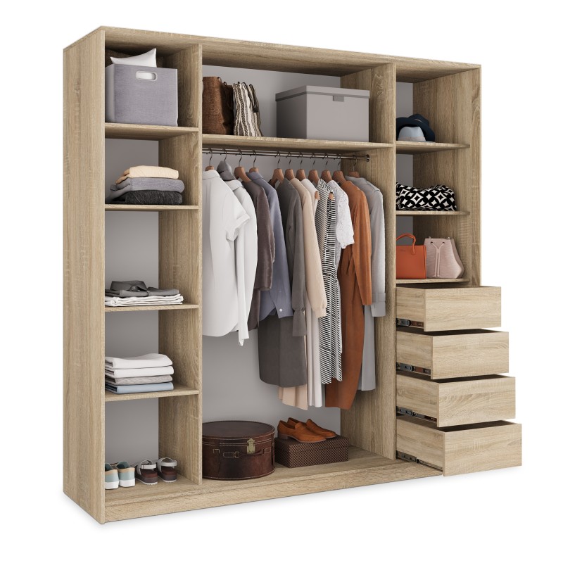 Wysokiej jakości system drzwi przesuwnych z aluminium zapewnia płynne i ciche użytkowanie, a duże lustro optycznie powiększa pomieszczenie i wprowadza więcej światła. Wnętrze szafy zostało zaprojektowane z myślą o praktycznym przechowywaniu – znajdziesz tu 4 pojemne szuflady, drążek na wieszaki i półki na odzież, buty lub dodatki.