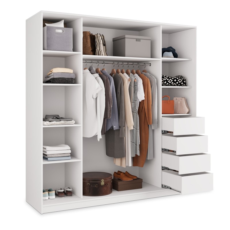 Wysokiej jakości system drzwi przesuwnych z aluminium zapewnia płynne i ciche użytkowanie, a duże lustro optycznie powiększa pomieszczenie i wprowadza więcej światła. Wnętrze szafy zostało zaprojektowane z myślą o praktycznym przechowywaniu – znajdziesz tu 4 pojemne szuflady, drążek na wieszaki i półki na odzież, buty lub dodatki.