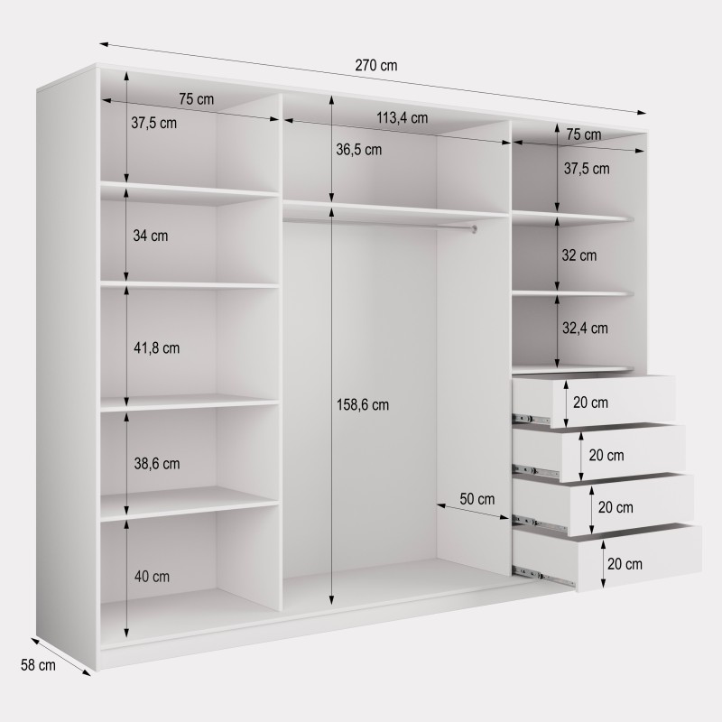 Wysokiej jakości system drzwi przesuwnych z aluminium zapewnia płynne i ciche użytkowanie, a duże lustro optycznie powiększa pomieszczenie i wprowadza więcej światła. Wnętrze szafy zostało zaprojektowane z myślą o praktycznym przechowywaniu – znajdziesz tu 4 pojemne szuflady, drążek na wieszaki i półki na odzież, buty lub dodatki.