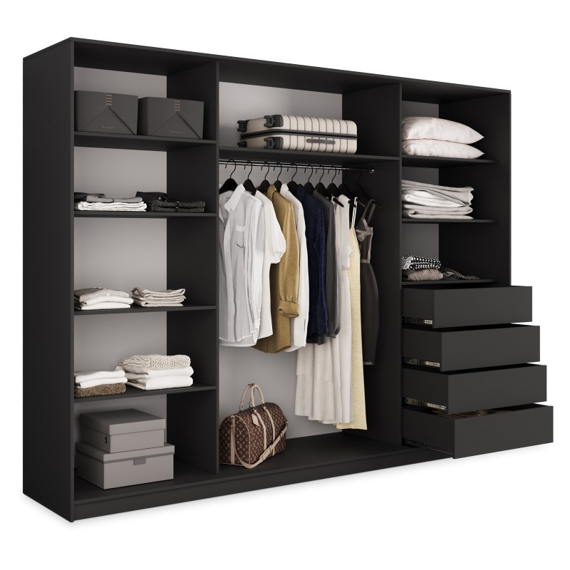Wysokiej jakości system drzwi przesuwnych z aluminium zapewnia płynne i ciche użytkowanie, a duże lustro optycznie powiększa pomieszczenie i wprowadza więcej światła. Wnętrze szafy zostało zaprojektowane z myślą o praktycznym przechowywaniu – znajdziesz tu 4 pojemne szuflady, drążek na wieszaki i półki na odzież, buty lub dodatki.