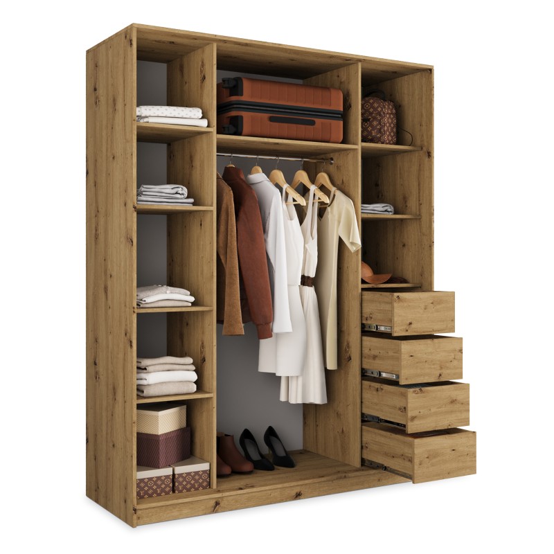Wysokiej jakości system drzwi przesuwnych z aluminium zapewnia płynne i ciche użytkowanie, a duże lustro optycznie powiększa pomieszczenie i wprowadza więcej światła. Wnętrze szafy zostało zaprojektowane z myślą o praktycznym przechowywaniu – znajdziesz tu 4 pojemne szuflady, drążek na wieszaki i półki na odzież, buty lub dodatki.