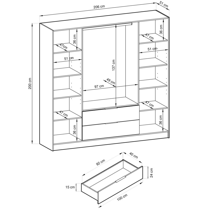 - Dzięki przemyślanemu układowi wnętrza umożliwia łatwą organizację ubrań, obuwia i akcesoriów. Zawsze masz wszystko pod ręką, a Twoje rzeczy są starannie uporządkowane.